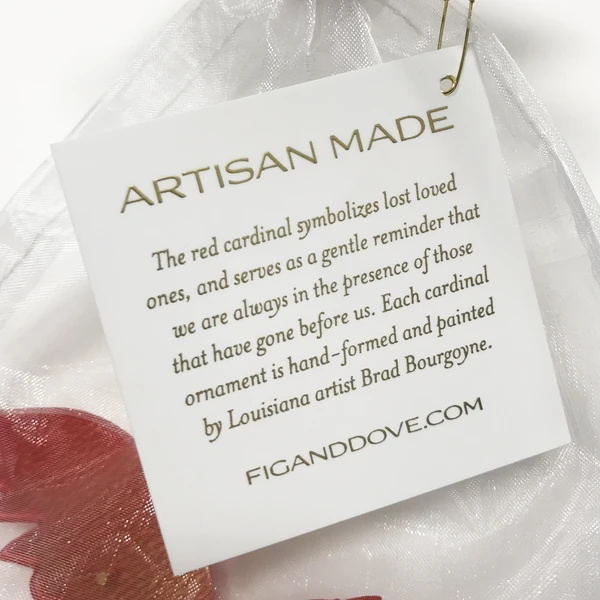 - Pre-wrapped in gift bag with Fig & Dove tag sharing the meaning of the cardinal