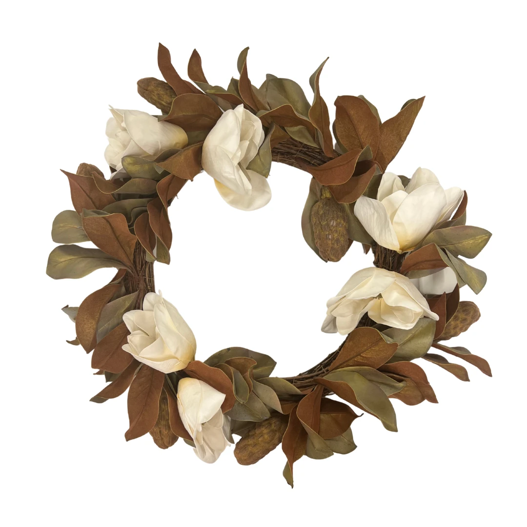 A beautiful new addition to our Wreath Collection.  This stunning Magnolia Wreath is a show stopper that you can keep up year-round. Handcrafted of “Real-touch” faux magnolia leaves and flowers, this classic, year-round wreath will add a cheerful touch to your home.  It’s soft muted palette of brown, white and green signifies understated elegance.