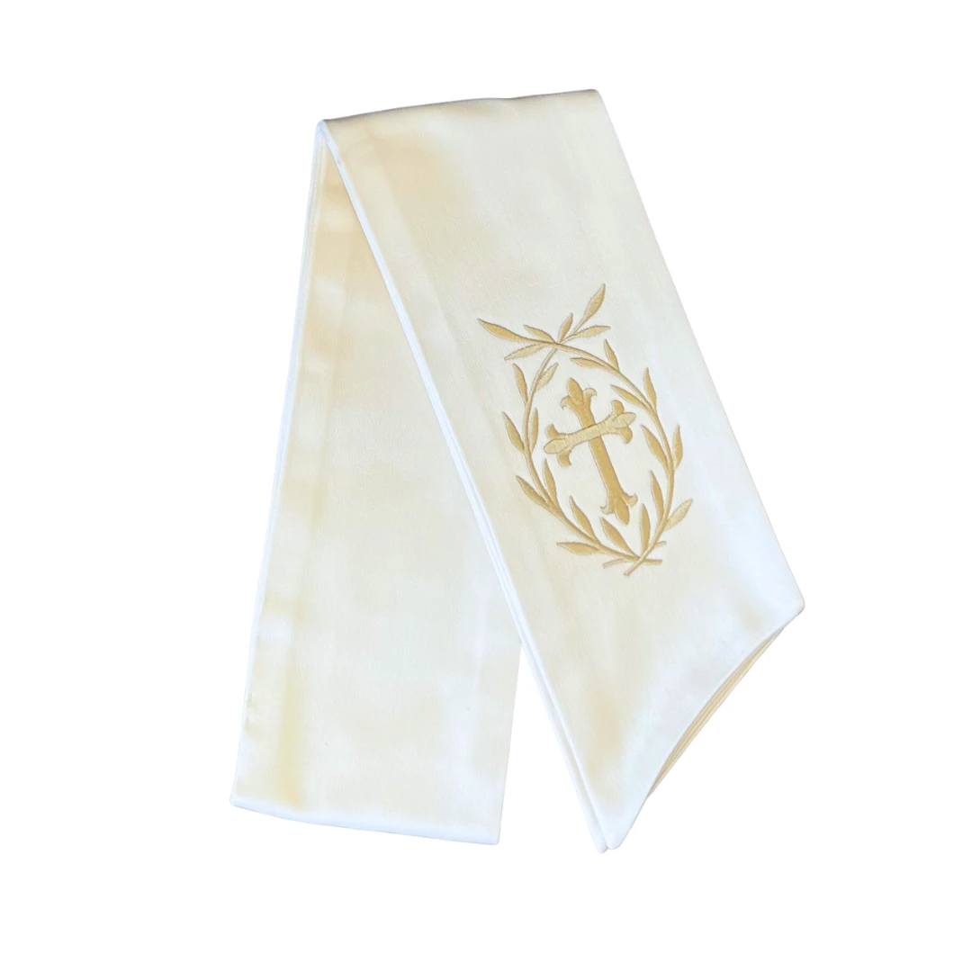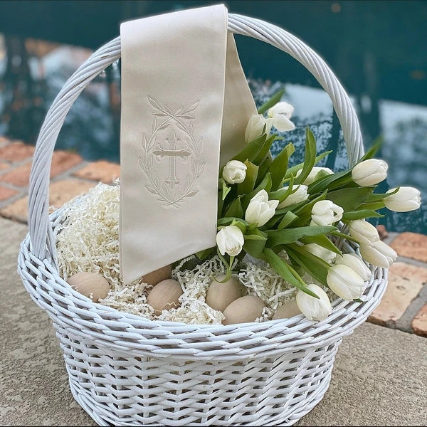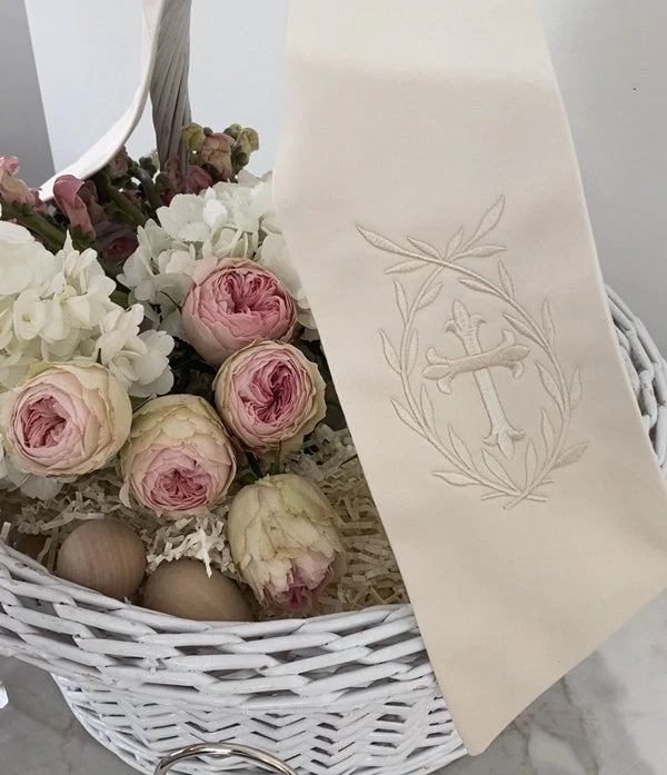 Adding a spiritual element to our signature wreath sash collection, theĀ Cross Wreath Sash features a tone-on-tone or gold embroidered cross embellished with a laurel wreath. Designed to celebrate special religious occasions, this sash is a gorgeous addition to Ā a wreath for weddings, baptisms, first communions, and all other religious holidays.