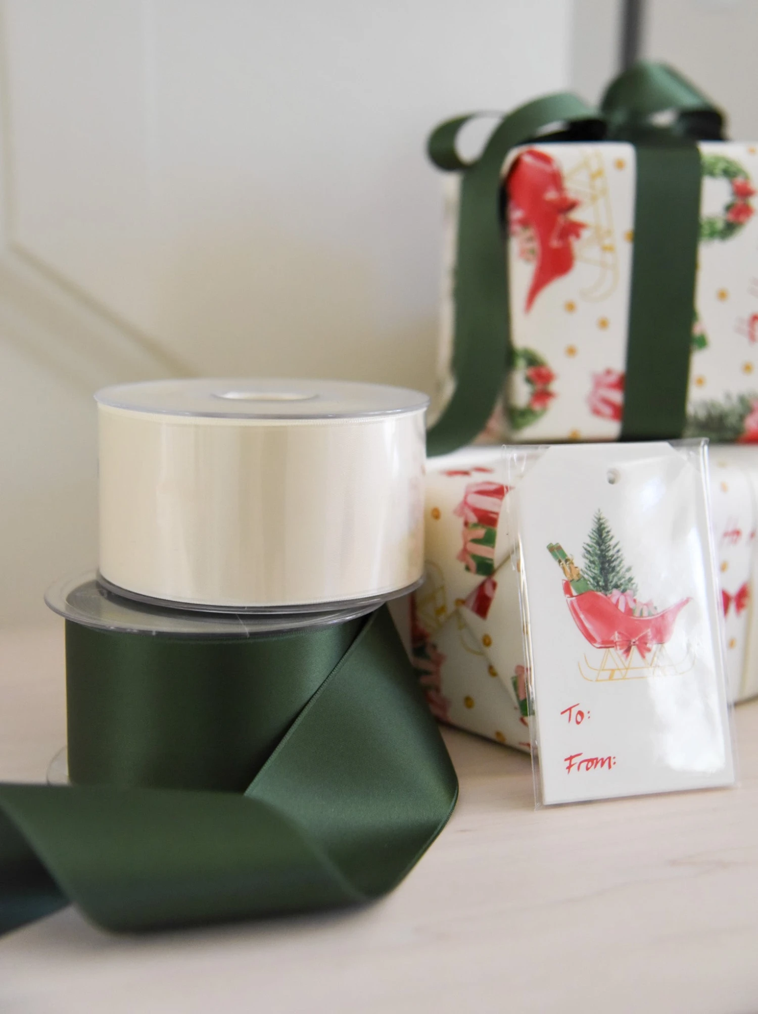 Christmas wrapping paper roll by Dogwood Hill features an all over pattern of red and green Christmas imagery with gold dots against a white background.  Pairs with Dogwood Hill Toast of the East Coast Sleigh Gift Tags.
