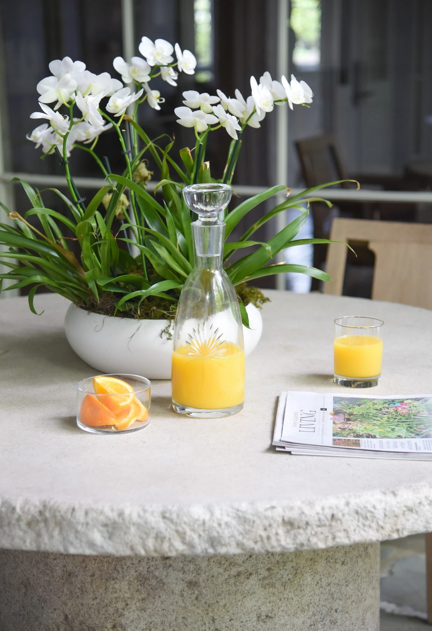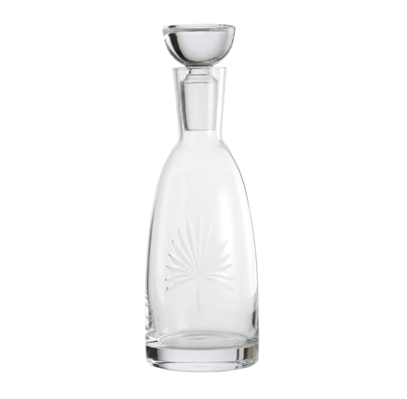The Palmetto decanter is a crystal clear decanter featuring a palm leaf engraving. This piece is complemented by a matching whiskey glass and coasters.Â