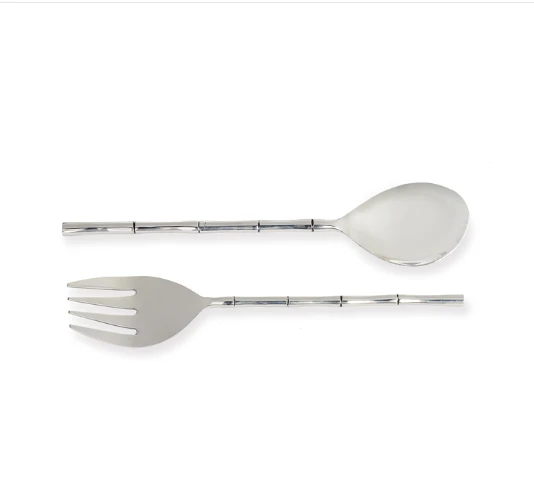 Available in brass and silver, this 2-piece set includes one serving fork and one serving spoon. Each utensil features a gleaming mirror finish, a beautifully balanced weight, and bamboo-inspired handle.