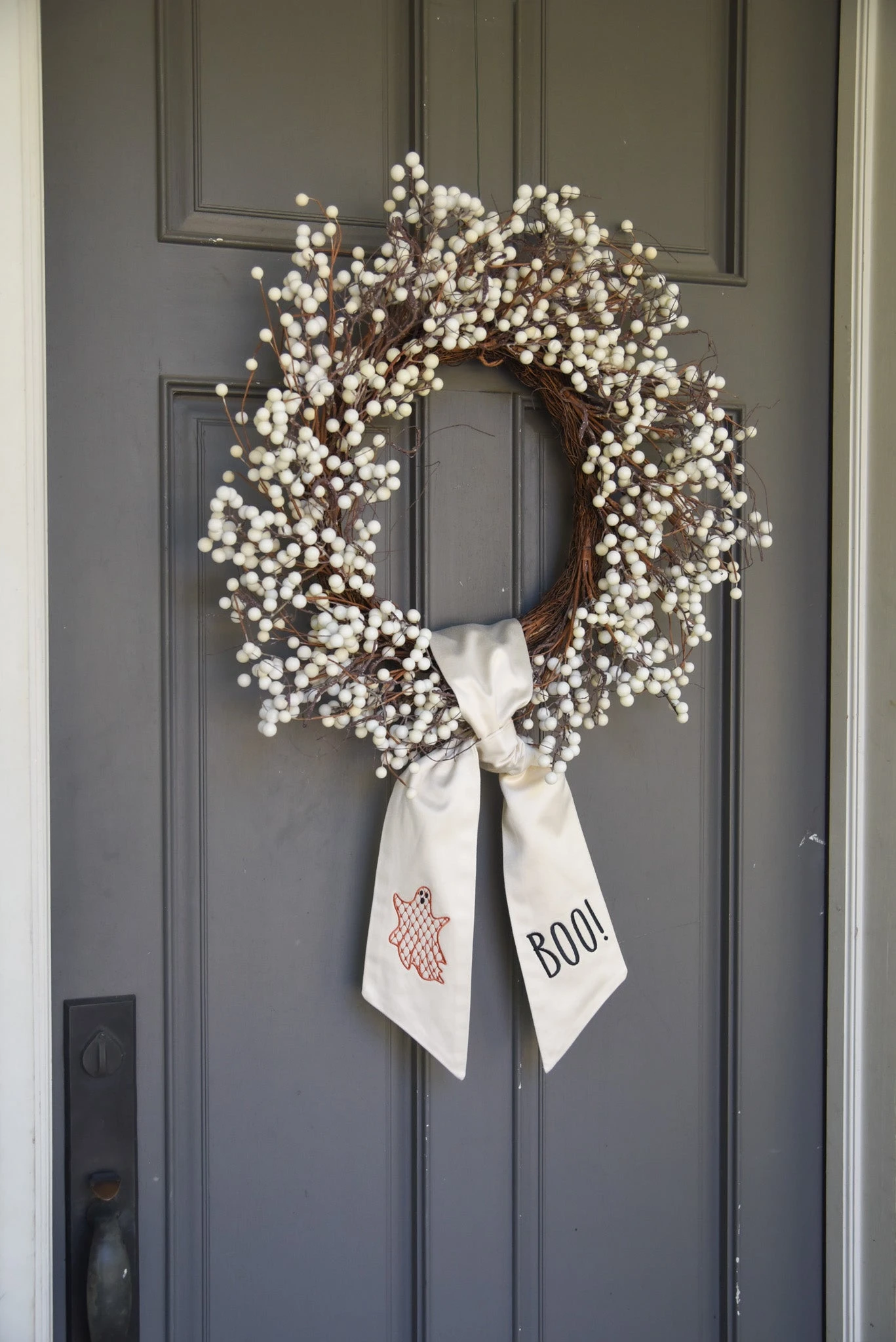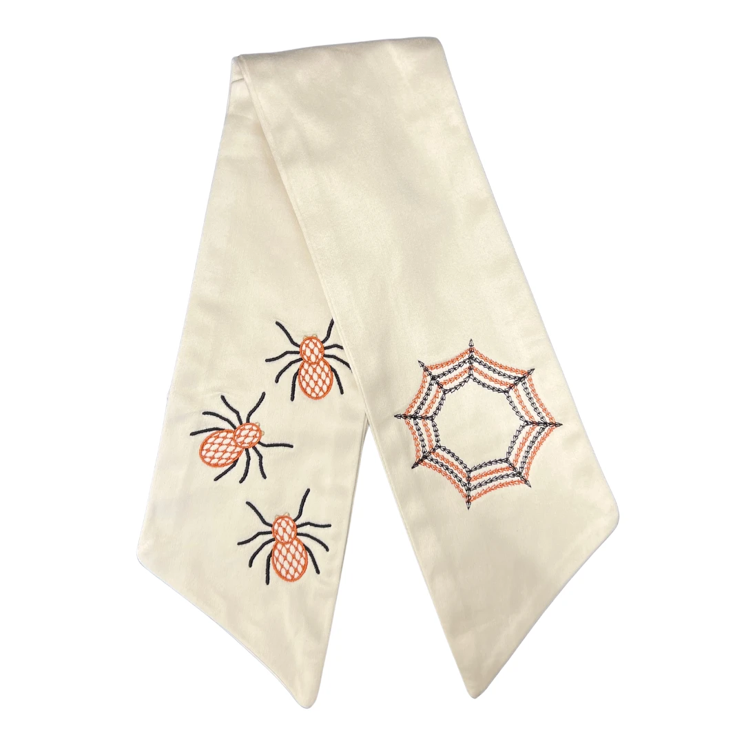 Happy Halloween! Put a spell on the entire neighborhood with our Spooky Sashes featuring embroidered ghost and spider designs on our signature ivory wreath sash.Â