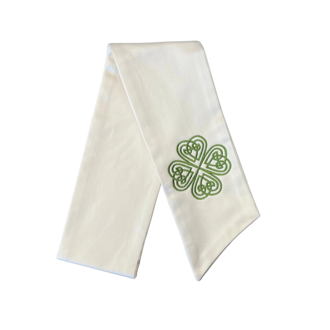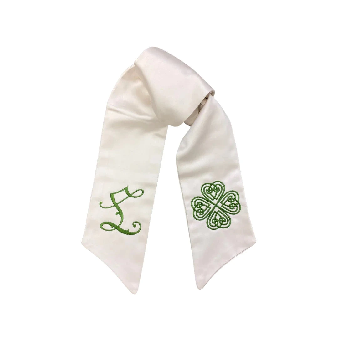 Share the luck of the Irish with our St. Patrick’s Day wreath sash, featuring an embroidered green four-leaf clover on our best-selling ivory wreath sash. This sash is the perfect addition to your holiday festivities and allows you to proudly display your Irish spirit. Enjoy the holiday with style!